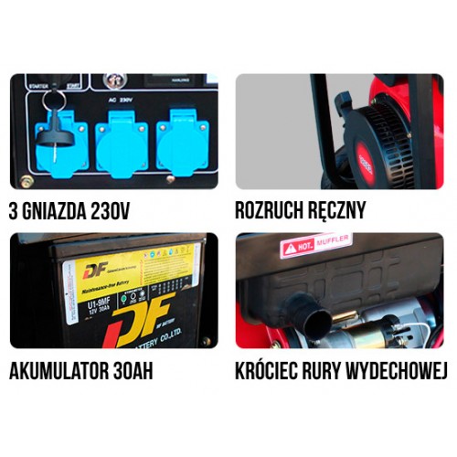 Уровень вибраций и шумов - невысокий. Масса агрегата - 110 кг. Есть встроенный регулятор напряжения - AVR. Охлаждение двигателя - воздушное. Тип генератора - синхронный, щеточный. Размер модели - 755х520х620 мм. Гарантия от компании-производителя составляет восемнадцать месяцев. Расход топлива очень экономный - не более 340 грамм за час работы. Использовать эту модель можно как в быту, так и на производстве, на строительной площадке, в гараже, передвижной торговой точке и детских или медицинских учреждениях, подключая к ней бытовые приборы - холодильники, компьютеры, телевизоры, центральное освещение, а также - рабочие инструменты, садовую и строительно-ремонтную технику.